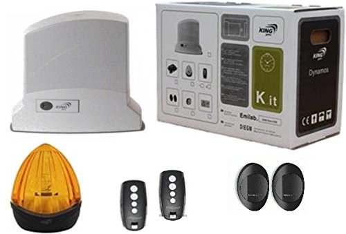 Pilt: Üleview of the KING GATES Dy Kit 24/600 Sliding Gate Automation System components, including the motor unit, control board, and accessories.